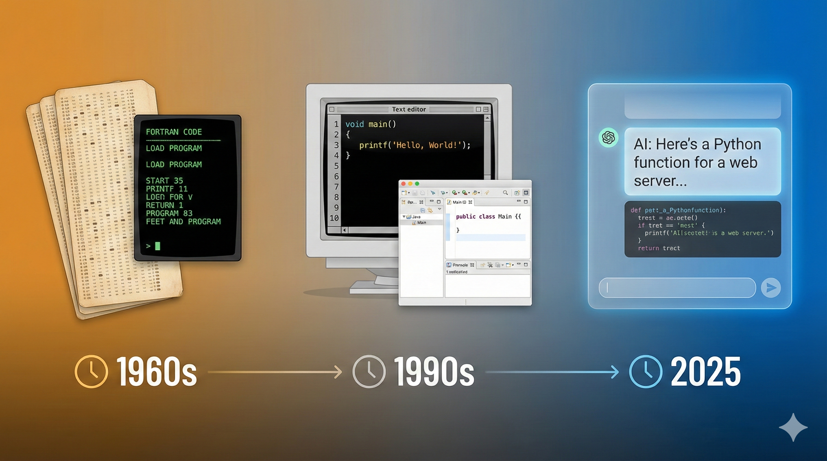 The trajectory is clear: from machine instructions to structured code to objects to functions to natural language. Each step removed one layer of mechanical translation from the developer’s mind. AI removes the last one.